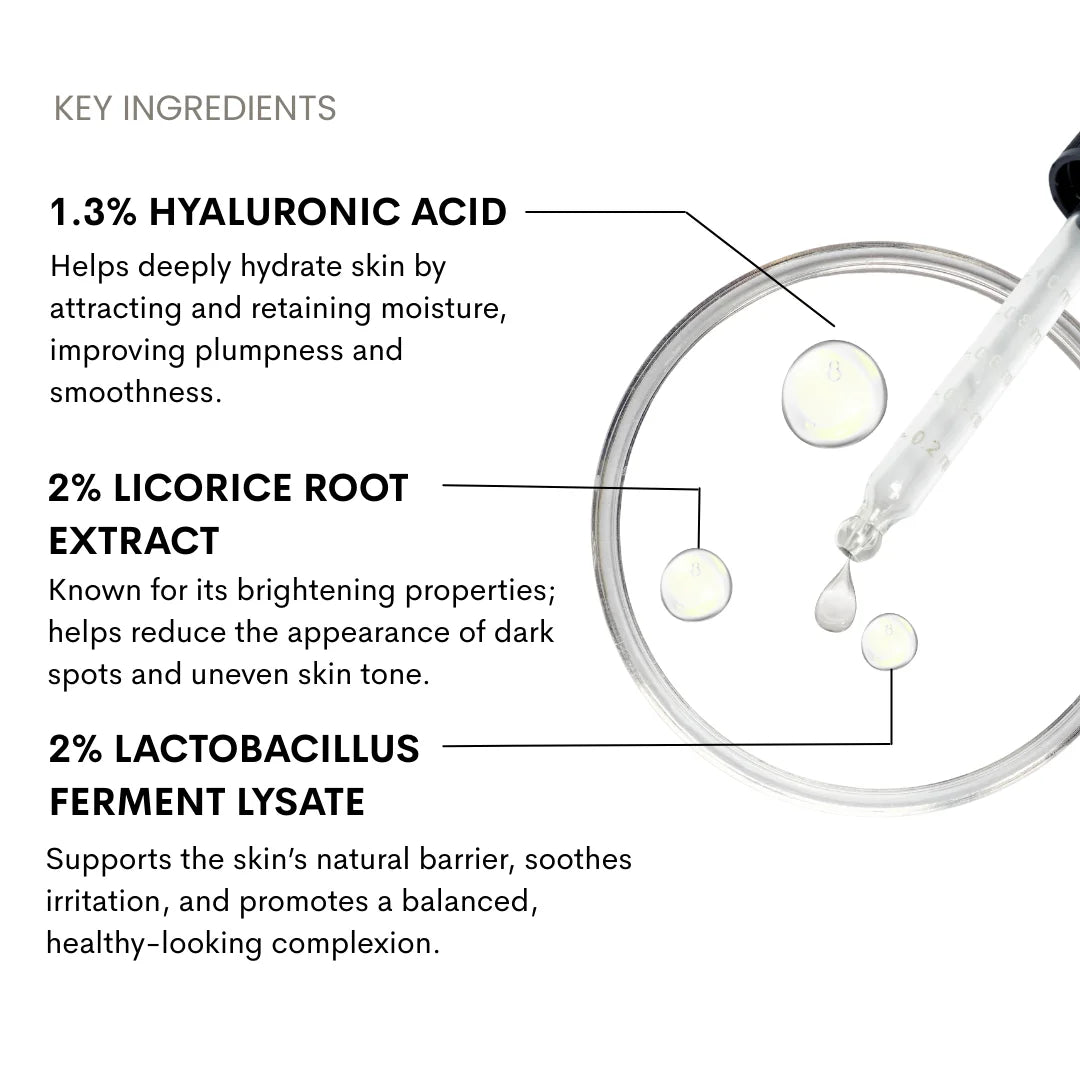 Our serum is a mixture of hyaluronic acid and licorice root extract. This innovative serum not only provides deep hydration but also brightens skin, softens soft lines and restores skin radiance and youthfulness.