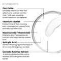 Zinc Oxide and Titanium Dioxide are mineral-based physical filters. They scatter, reflect, and partially absorb UVA/UVB while forming a highly photostable protective film. Clinical studies on sunscreens showed that zinc oxide provides broad UVA/UVB coverage, reduces UV-induced erythema, and limits ROS formation that can trigger melanogenesis, while titanium dioxide is highly effective for UVB and short UVA-II, improving everyday tolerance when combined with organic filters (1).