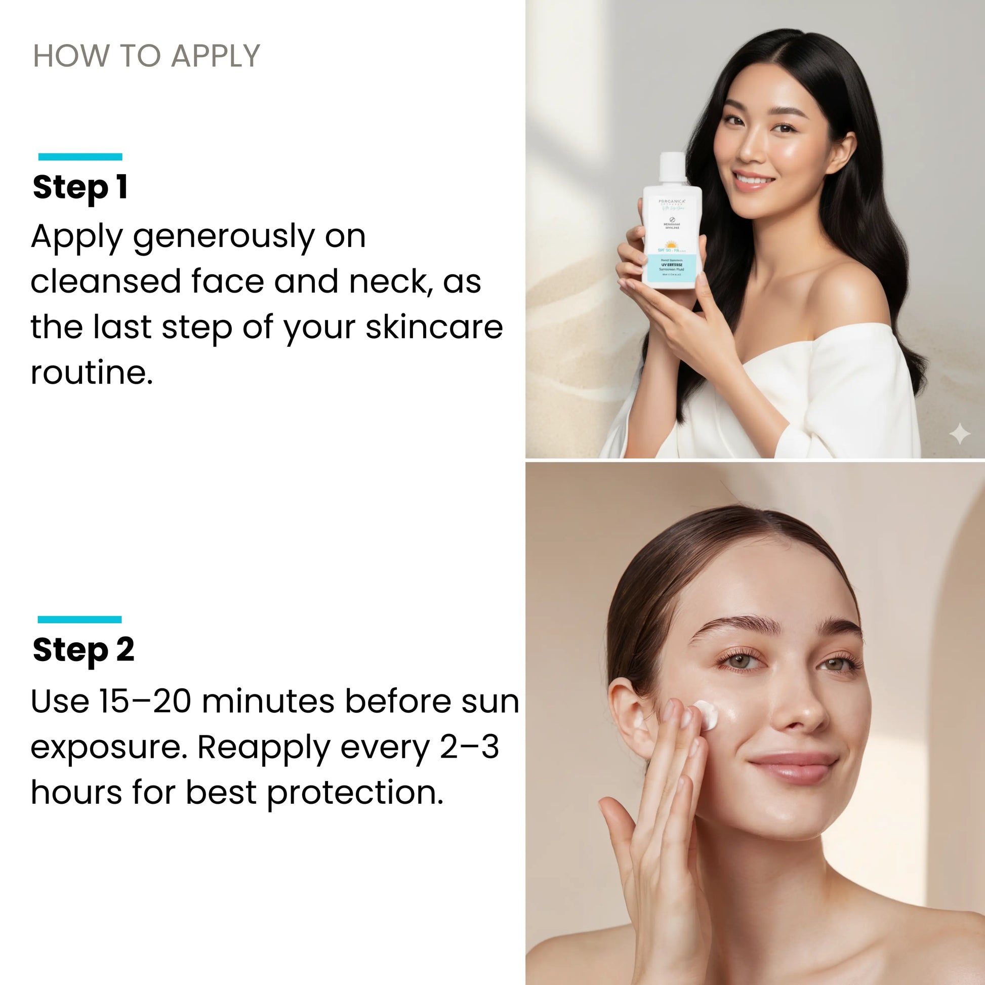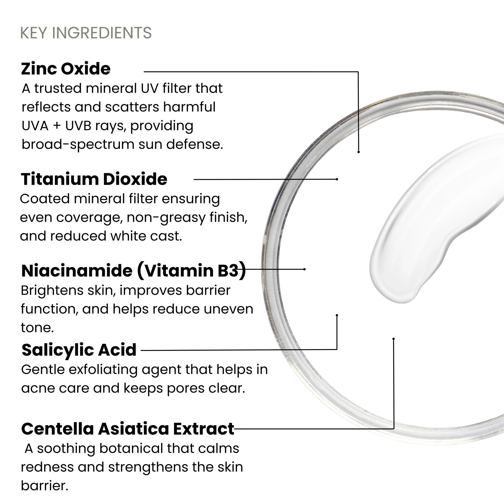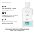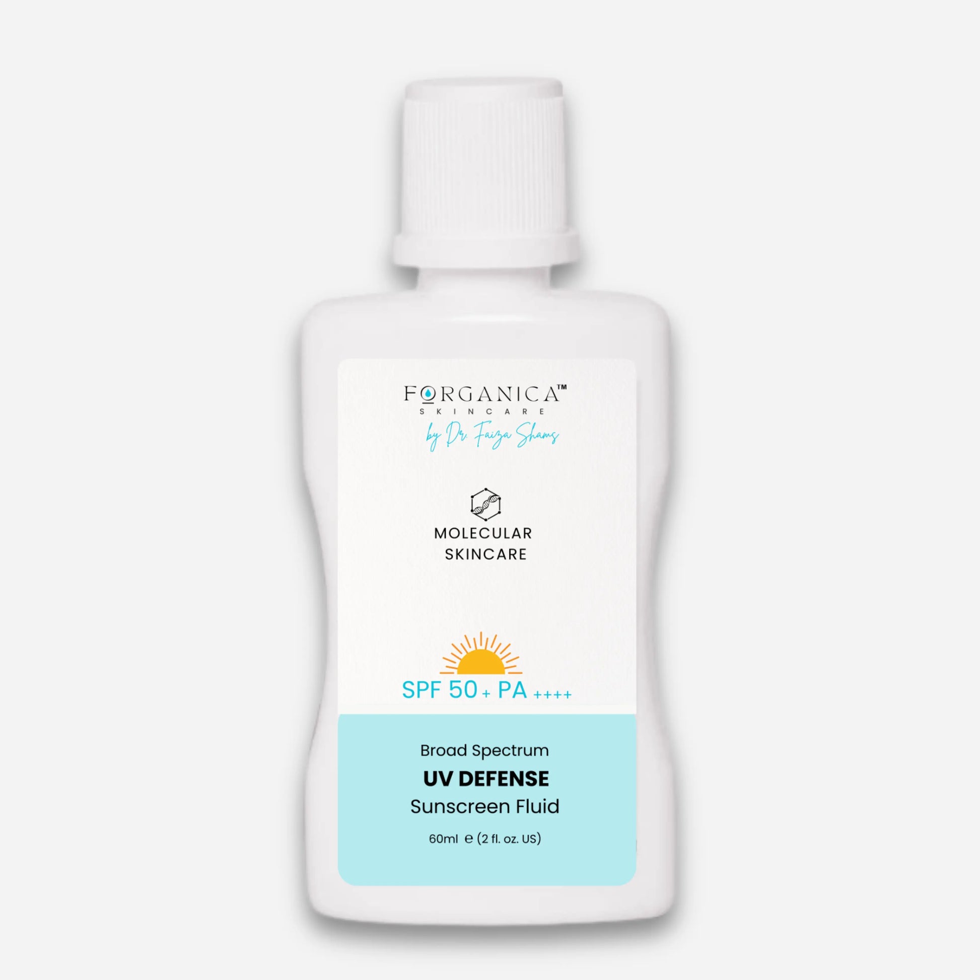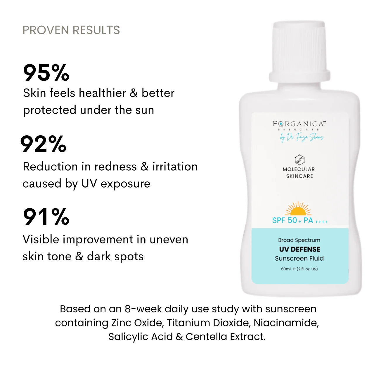 Antioxidants in Forganica Sunscreen reduce UV photon-driven ROS surges that trigger inflammatory mediators, lipid membrane oxidation, and premature collagen-fragmenting signals. Centella Asiatica Extract suppresses NF-κB cascades, reducing cellular erythema signalling. Niacinamide improves ceramide-dependent tight-junction integrity, lowering chronic redness and irritation signalling. Salicylic Acid regulates sebum-zone comedogenic stress cascades, sustaining non-irritant pore films. Together, these systems reduce cellular inflammation, maintain barrier resilience, prevent UV-driven melanin overexpression signals, and soothe sensitive skin responses during daily wear.